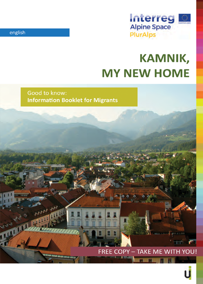 Knjižico z informacijami za priseljence "Kamnik, moj novi dom" smo pripravili kot eno od pilotnih aktivnosti v okviru projekta PlurAlps: Priseljevanje, kulturna raznolikost in pluralizem kot priložnosti za območje Alp (program INTERREG Območje Alp). Prinaša osnovne informacije o razpoložljivih storitvah na področju sociale, zdravstva, izobraževanja, zaposlovanja, učenja slovenščine, pomoči pri sporazumevanju ter informacije o kulturnih, športnih in društvenih dejavnostih v lokalnem okolju vsake od treh pilotnih občin. S knjižico želimo priseljencem olajšati prve korake v novem okolju in jih spodbuditi, da se vanj dejavno vključijo. Knjižice so pripravljene za občine Jesenice, Kamnik in Postojna, ki so se dejavno odzvale našemu povabilu, da se vključijo v projekt in da z izvedbo pilotnih aktivnosti prispevajo k bolj vključujočemu okolju za priseljence. Informativne knjižice so pripravljene v štirih jezikih in sicer: v albanskem, angleškem, bosanskem in makedonskem. Brezplačni tiskani izvodi so na voljo pri ponudnikih storitev (centri za socialno delo, upravne enote, zdravstveni domovi, ljudske univerze…) v posameznih občinah.